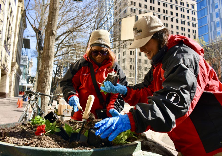 Every day, our team of 75 Downtown Ambassadors provides cleaning, safety and hospitality services throughout the PID in the public right of way from 6am-11pm. They provide information, visitor assistance, local insider tips, cleanup and report infrastructure needs and issues to the city. Ambassadors also work on beautification projects that enhance the downtown experience. You may recognize them working hard on the streets in their Downtown Austin Alliance red polo shirts or Republic Square green polo shirts.
