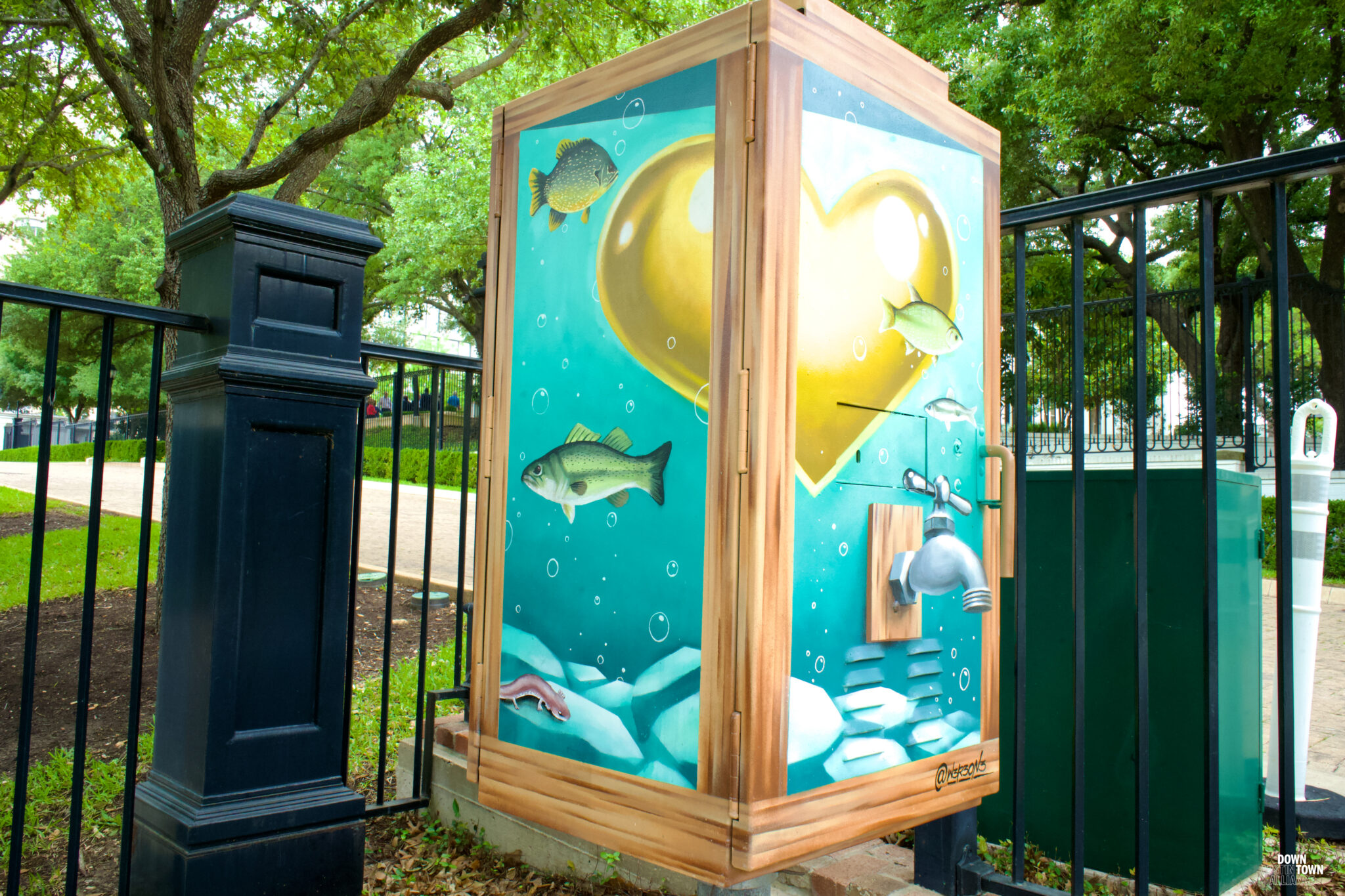W3R3ON3’s ARTBOX outside of the Texas Governor’s Mansion off of 11th Street focuses on the theme of water as a scarce and valuable resource.