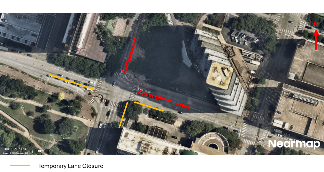 - Northbound traffic on Congress Avenue will see an outside lane closure at Cesar Chavez.
